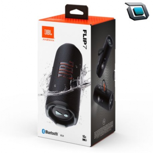Altavoz Bluetooth portátil resistente al agua JBL Flip 7 (negro) Sistema de altavoces de 2 vías de 35 W Diseño a prueba de agua y polvo Puede soportar caídas de hasta 3,3 pies Calidad mejorada con AI Sound Boost Hasta 14 horas de duración de la batería Hasta 2 horas adicionales con Playtime Boost Audio multialtavoz sin pares Auracast Audio sin pérdida mediante fuentes USB-C Accesorios intercambiables PushLock Construcción y embalaje ecológicos
